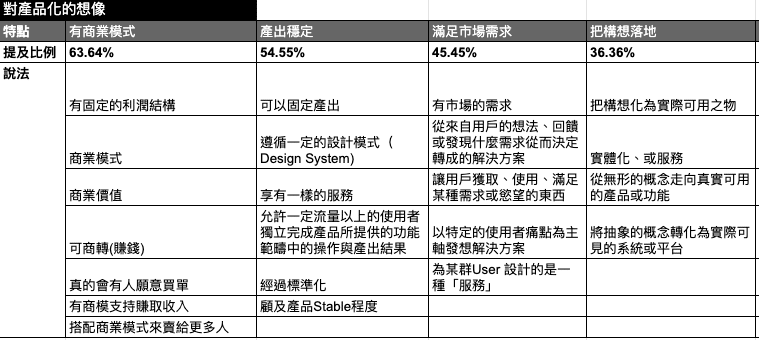 「覺得可能是從來自用戶的想法、回饋或發現什麼需求從而決定轉成的解決方案, 然後把這些想法概念更具體的轉變成有商業價值、實體化、或服務的過程就是產品化。」